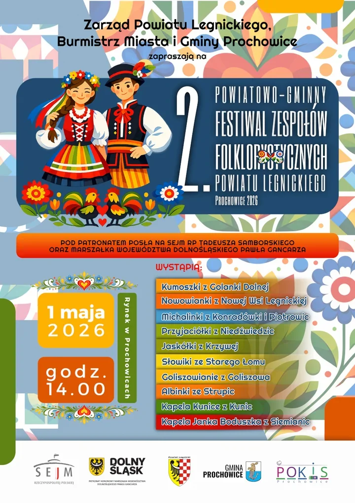 Na początku maja w Prochowicach zrobi się głośno od ludowych melodii i kolorów strojów. Druga odsłona powiatowo-gminnego festiwalu ma zgromadzić zespoły folklorystyczne z regionu, a scena ma zamienić się w miejsce spotkania pieśni, tańca i obrzędów. Za wydarzeniem stoją Zarząd Powiatu Legnickiego i burmistrz Prochowic, którzy zapraszają na dzień z tradycją bez muzealnego dystansu. To właśnie taki moment, w którym regionalne dziedzictwo najłatwiej zobaczyć z bliska.