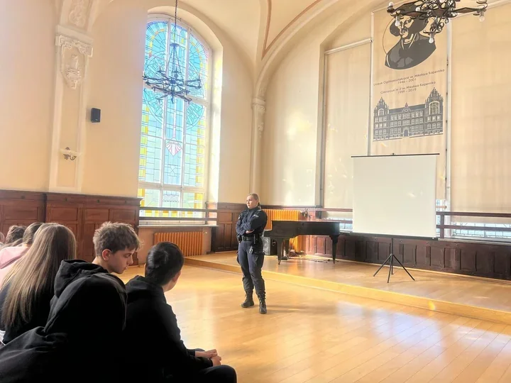 Policjanci skupili się na zagrożeniach, które młodzi ludzie spotykają zarówno poza szkołą, jak i w internecie. Mówili o demoralizacji wśród młodzieży i o tym, jak reagować na niewłaściwe zachowania. Zwrócili też uwagę na znaczenie wzajemnego szacunku w relacjach rówieśniczych i w sieci.