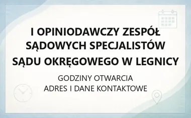 I Opiniodawczy Zespół Sądowych Specjalistów (OZSS) przy Sądzie Okręgowym w Legnicy to jednostka specjalistyczna obsługująca sądy rejonowe w Legnicy, Jaworze i Złotoryi. Zespół sporządza opinie psychologiczne, pedagogiczne i lekarskie na zlecenie sądów i prokuratury, prowadzi mediacje oraz udziela poradnictwa specjalistycznego w sprawach rodzinnych i nieletnich. Siedziba Zespołu mieści się przy ul. Drohobyckiej 1, natomiast sprawy administracyjne i wnioski o informację publiczną załatwia się w Biurze Podawczym Sądu Okręgowego przy ul. Złotoryjskiej 40.