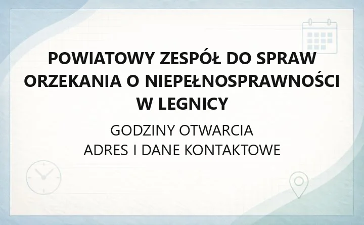 Powiatowy Zespół do spraw Orzekania o Niepełnosprawności w Legnicy działa przy Pl. Słowiańskim 1, 59-220 Legnica (III piętro, pokój 316). Mieszkańcy składają tu wnioski o orzeczenie o niepełnosprawności i załatwiają sprawy związane z odwołaniem. Orzeczenie jest bezpłatne, a sprawa powinna zostać zakończona nie później niż w ciągu miesiąca od złożenia wniosku. W sprawach szczególnie skomplikowanych termin wynosi do 2 miesięcy.