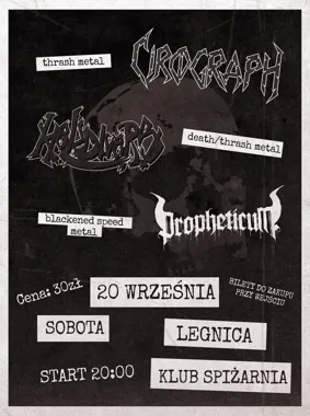 W Legnicy odbędzie się koncert trzech zespołów reprezentujących odmiany ciężkiego metalu: blacked-thrash, death-thrash i cięższe riffy w klimatach metalowych. Wydarzenie ma formę lokalnego koncertu klubowego w sali koncertowej „Spiżarnia” — propozycja dla fanów szybkiego, agresywnego grania i sceny headbangingowej.
